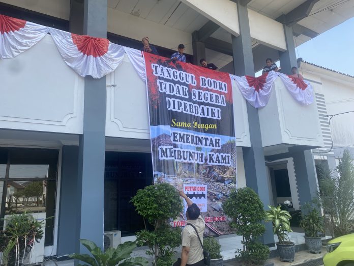 Kendal – Selalu dihantui rasa takut banjir bandang berulang, seratusan warga Desa Kebonharjo yang tergabung dalam Forum Peduli Tanggul Kali Bodri (Petak Bodri) melakukan audiensi di Gedung DPRD Kendal, Senin (28/7/2025). Dengan membentangkan baliho bertulis, Tanggul Kali Bodri Tidak Segera Diperbaiki Sama Dengan Pemerintah Membunuh Kami, warga mendesak pimpinan DPRD Kendal dan pejabat terkait mempercepat perbaikan tanggul Kali Bodri, paska banjir bandang akibat jebolnya tanggul Kali Bodri 21 Januari lalu.”Enam bulan lebih paska banjir bandang, kondisi tanggul yang jebol sudah pada longsor dan sepanjang 250 M disebarkannya tergerus dan kritis. Kalau tidak segera dibangun permanen dikhawatirkan akan jebol lagi saat musim hujan datang,” tegas Ketua Petak Bodri, Arif Fajar Hidayat.