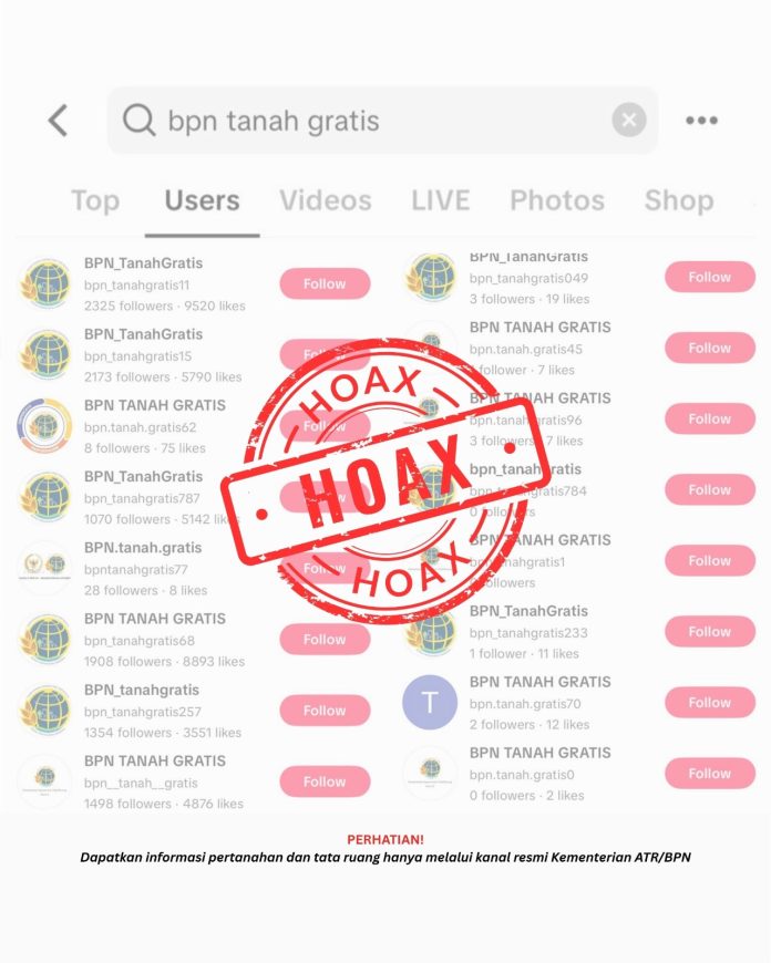 Kepala Biro Hubungan Masyarakat (Humas) dan Protokol, Harison Mocodompis, menyampaikan agar masyarakat berhati-hati terhadap akun media sosial yang tidak jelas sumbernya. “Kami melihat banyak sekali akun TikTok @bpn_tanahgratis beredar. Untuk itu, masyarakat diimbau untuk tidak terpengaruh dengan akun media sosial tidak resmi yang menyebarkan klaim seperti ‘BPN Tanah Gratis’. Informasi dan layanan resmi hanya dapat diperoleh melalui kanal resmi Kementerian, yakni situs atrbpn.go.id dan akun media sosial resmi kami,” tegasnya saat ditemui di Kantor Kementerian ATR/BPN, Jakarta, Selasa (19/08/2025).