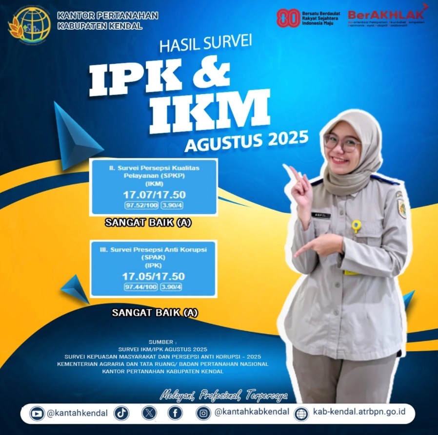​Berikut hasil Case Survey Management System bulan Agustus 2025 dengan Survei Persepsi Kualitas Pelayanan (IKM) adalah 17,07/17,50 (Sangat Baik) A dan Survei Persepsi Anti Korupsi (IPK) adalah 17,05/17,50 (Sangat Baik) A. Terima kasih atas penilaian yang telah diberikan untuk Kantor Pertanahan Kabupaten Kendal pada Survei Persepsi Kualitas Pelayanan (IKM) dan Survei Persepsi Anti Korupsi (IPK). Satu penilain Anda berarti banyak bagi perbaikan dan peningkatan kualitas pelayanan kami.