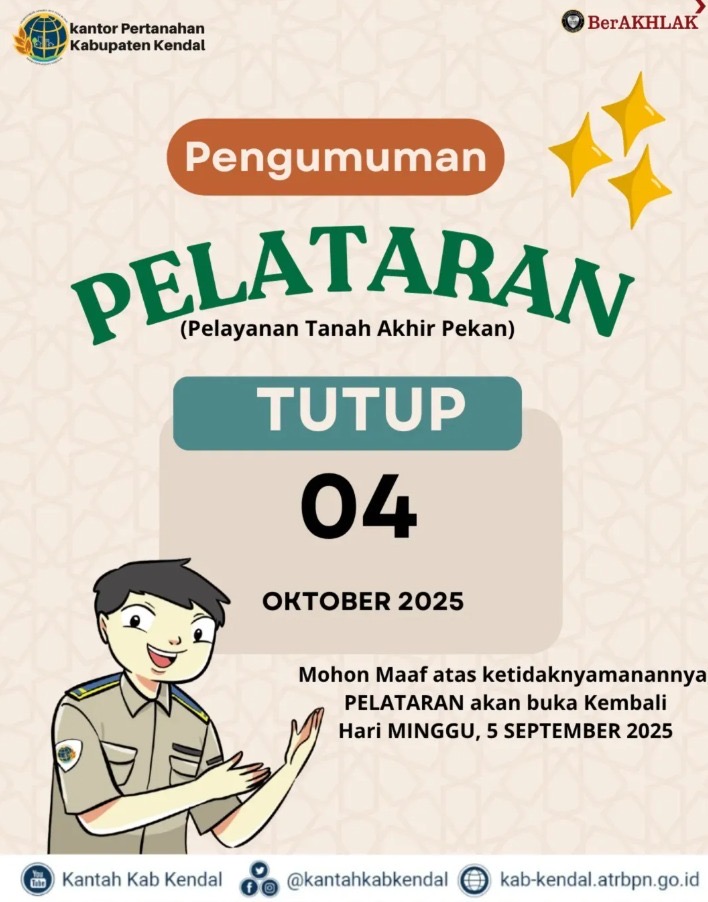 KENDAL -📢 Pengumuman Jam Pelayanan Sehubungan dengan adanya kegiatan Kantor Pertanahan Kabupaten Kendal, maka pada tanggal 4 Oktober 2025 Pelayanan Tanah Akhir Pekan (PELATARAN) di Kantor Pertanahan Kabupaten Kendal TUTUP dan akan buka kembali hari Minggu, 5 September 2025.